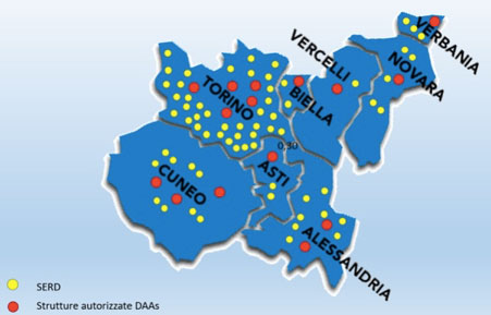 Prendiamo una regione a caso, il Piemonte. Mappiamo tutti i SerD e tutte le strutture autorizzate a curare con i farmaci innovativi, e cioè 16 strutture ospedaliere vs. 66 SerD da noi individuati.