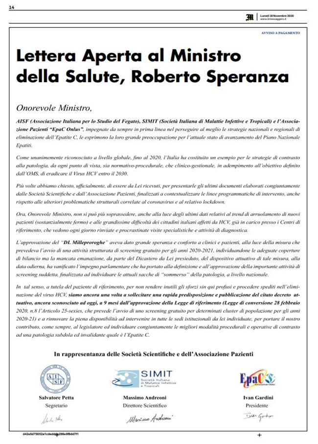 "La firma del ministro Speranza al decreto attuativo per lo screening nazionale dell’epatite-C rappresenta un passo fondamentale ed atteso nella lotta contro la malattia e soprattutto per rendere concreto l’utilizzo di 71 milioni di euro su due anni di...