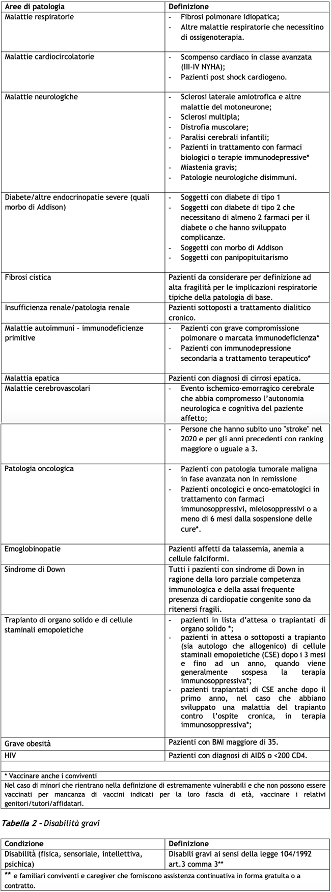 Categoria 1. Elevata fragilità. Nel definire i gruppi a cui dare priorità nella campagna di vaccinazione si è tenuto conto, anche attraverso un confronto con società scientifiche di riferimento, della particolare fragilità di alcune categorie di cittadini affetti da specifiche patologie valutate come particolarmente critiche in quanto correlate al tasso di letalità associata a COVID-19 per danno d’organo preesistente o compromessa capacità di risposta immunitaria a SARS-CoV-2, definite estremamente vulnerabili (tabella 1) e dei portatori di disabilità gravi ai sensi della legge 104/1992 art.3 comma 3 (tabella 2).